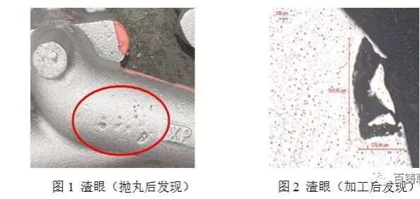 在铸件外部和内部的孔穴中有非金属夹杂物,形状极不规则,颜色各异。铸件抛丸后留下不规则的孔洞。俗称渣孔。渣孔多出现在铸件的上表面,砂芯的下表面或熔渣不易浮起的地方。(在铸件表面的浆渣抛丸后凹坑表面较光滑)